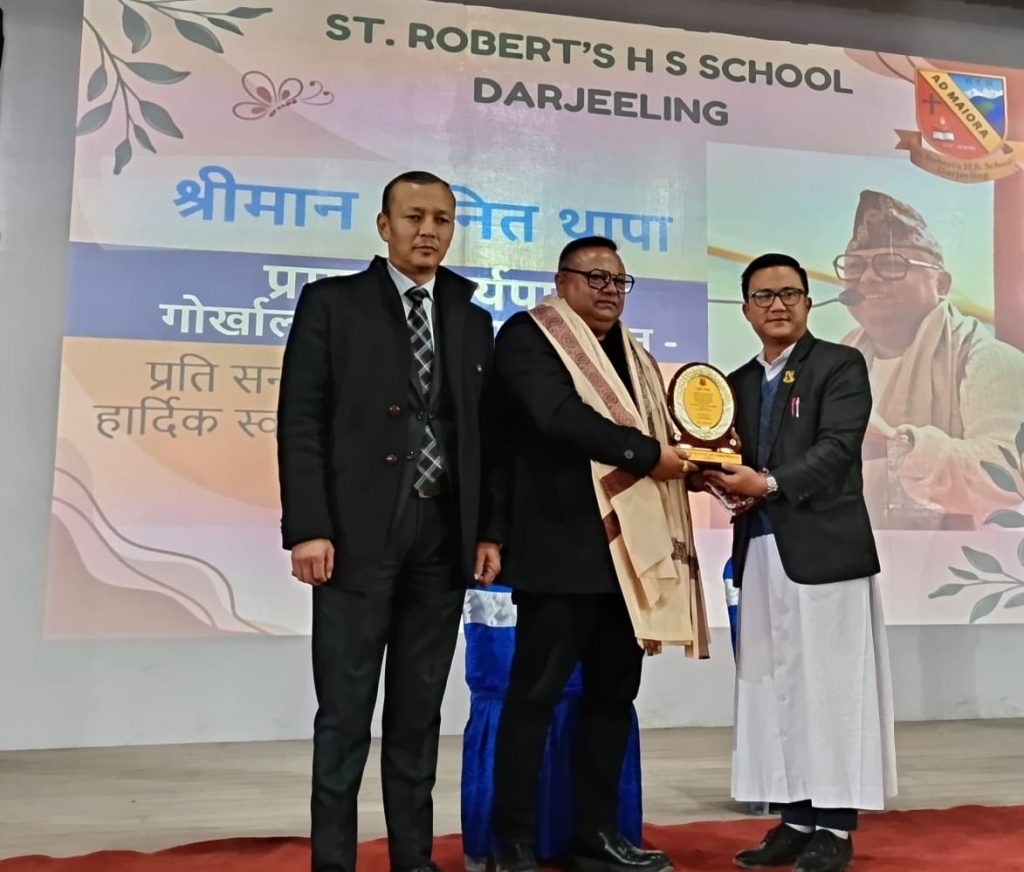 दार्जीलिङ,19 नोभेम्बर(निसं): गोर्खाल्याण्ड क्षेत्रीय प्रशासनका प्रमुख कार्यपाल अनित थापा आफ्नो विभागीय अधिकारी र केही सभासद् अनि दार्जीलिङ नगरपालिका अध्यक्षका साथमा सेन्ट रोबर्टस् हायर सेकेण्डरी स्कूल भ्रमणमा पुगेका थिए। उनको आगमनमा विद्यालयको पक्षबाट एनसीसी क्याडेट र जयहिन्द वाहिनीका विद्यार्थीहरूले प्रवेशद्वार देखि नै एस्कट गरेर प्रमुख कार्यपाल र उनको टोलीलाई विद्यालय परिसरमा प्रवेश गराएपछि उनको सम्मानमा स्वागत् कार्यक्रम विद्यालयकाे रङ्गशालामा सम्पन्न भयो, जहाँ विद्यालयकाे पक्षबाट टिचर्स को-अर्डिनेटर रभरेन फादर सञ्जोक राई र राजा लामाले शिरशोभा, अङ्ग-वस्त्र, खादा अनि स्मृति चिह्न भेट गर्दै उनलाई अभिनन्दन जनाए। उल्लेखनीय छ, गत अक्टोबर महिनामा विद्यालयले मञ्चन गरेको पूर्णाङ्की नाटक पलायन- अवलोकन गर्न प्रमुख अतिथिका रूपमा उनलाई निम्त्याएको थियो तर अन्तिम क्षणमा अचानक बाहिर जान परेकोले उनलाई प्रतिधित्व गरेर आएका जीटीए सभापति अञ्जुल चौहानले विद्यालयकाे भौतिक पूर्वाधारहरुको खाँचोलाई मध्य नजरमा राखेर जीटीएको पक्षबाट ग्यालेरी सहितको एउटा बास्केटबल कोर्ट अनि सुन्दर विद्यालय उद्यान बनाइदिने प्रतिश्रुति दिएका थिए। त्यसैको पुनरावलोकन गर्न अनि विद्यालयको परिभ्रमण गर्न आएको मौकामा आफ्नो कर्तव्य निर्वाह गर्दै यसरी उनलाई विद्यालयले शिष्टाचार पूर्वक आभार व्यक्त गरेको कुराे विद्यालयका मिडिया इञ्चार्ज तथा सह-शिक्षक सुनील राई प्रणामीले विज्ञप्ति मार्फत् जनाएका छन्। सह शिक्षक अमिट थापाले सञ्चालन गरेकाे स्वागत् कार्यक्रमलाई सम्बोधन गर्दै अनित थापाले विद्यार्थीहरूलाई सबथोक छोडेर अध्ययनमा मात्र ध्यान दिने सुझाव दिए। यसका साथै आफू विद्यार्थी भएको बेला पढाई छोडेर दिनरात जुलुसमा जानुपर्ने राजनैतिक परिवेशमा हुर्केका दिनको सम्झना गर्दै अब पहाड़मा त्यस प्रकारको परिवेश समाप्त भइसकेको बताए।