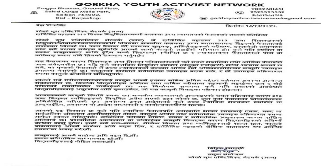 कुनै पनि न्यायिक फैसलाप्रति असहमति भएमा दबाब, बन्द वा सार्वजनिक जीवनमा अवरोध सिर्जना गर्ने माध्यमभन्दा कानुनी अपिल र संवैधानिक प्रक्रियामार्फत समाधान खोजिनुपर्नेमा ज्ञानले जोड दिएको छ। दार्जिलिङ पहाडमा शान्ति, संयम र संवैधानिक अनुशासन कायम राख्नु अपरिहार्य रहेको उल्लेख गर्दै, प्रशासनिक असफलता वा कानुनी विवादका कारण विद्यार्थीहरूको भविष्य बन्धक बन्न नहुने संगठनले स्पष्ट पारेको छ।