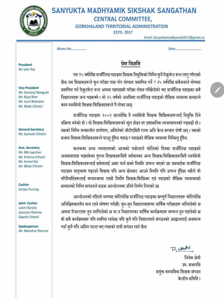 यसैवीच दार्जीलिङको संयुक्त माध्यमिक शिक्षक संगठन केन्द्रिय समिति उपाध्यक्ष विवेक छेत्री अनि महासचिव सन्तोस खडकाले एक प्रेस विज्ञप्ति जारी गर्दै भनेका छन्,दार्जीलिङ पहाड़का सम्पूर्ण विद्यालयहरू अनिश्चितकालीन रूपमा बन्द हुने शिक्षक संगठनको घोषणा छ। गत 25 वर्षदेखि दार्जीलिङ पहाड़मा शिक्षक नियुक्तिको निम्ति कुनै रिक्रुमेन्ट रूल लागु गरिएको छैन।