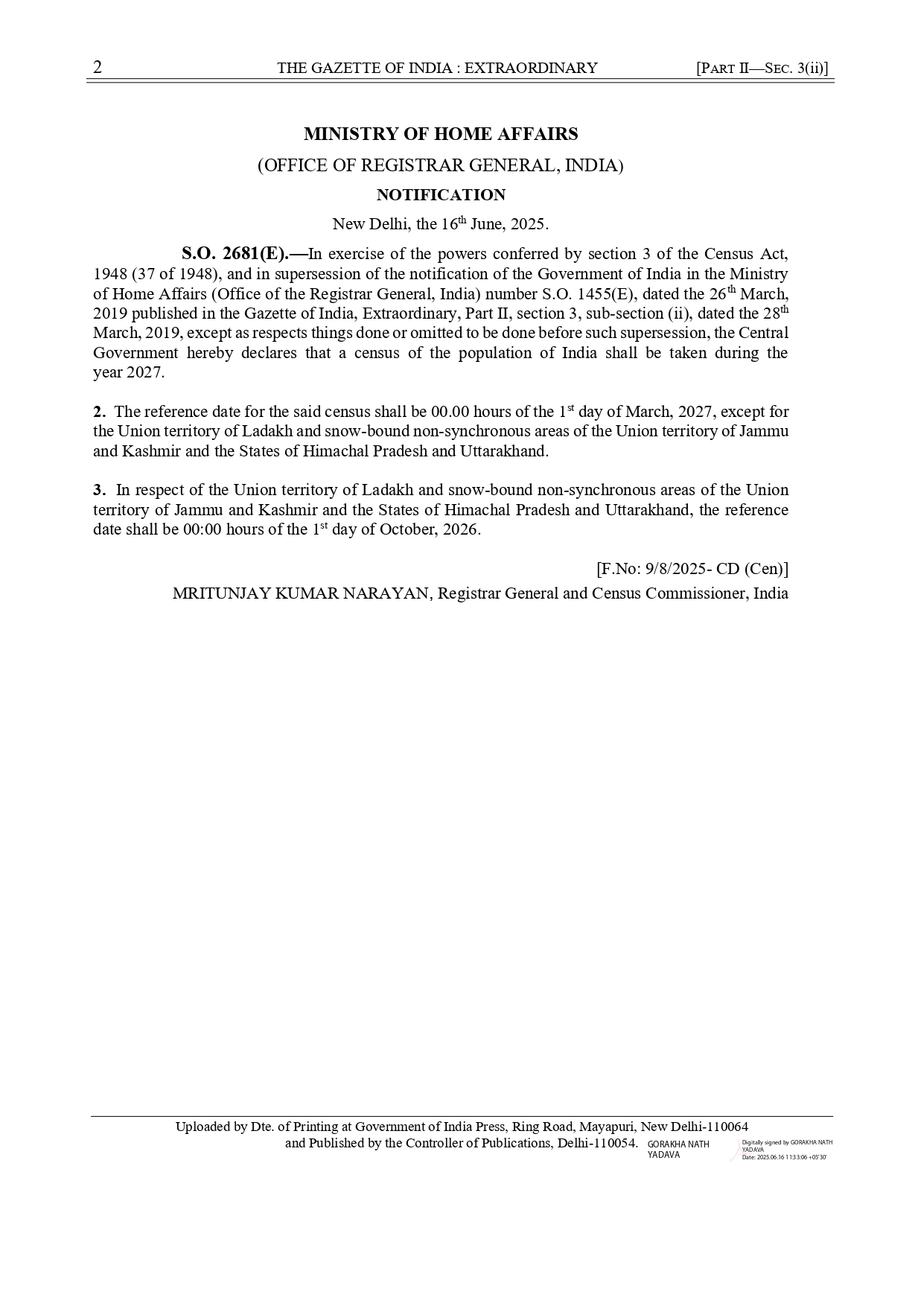 जनगणनाको बारेमा गृहमन्त्रालयको अधिसूचना