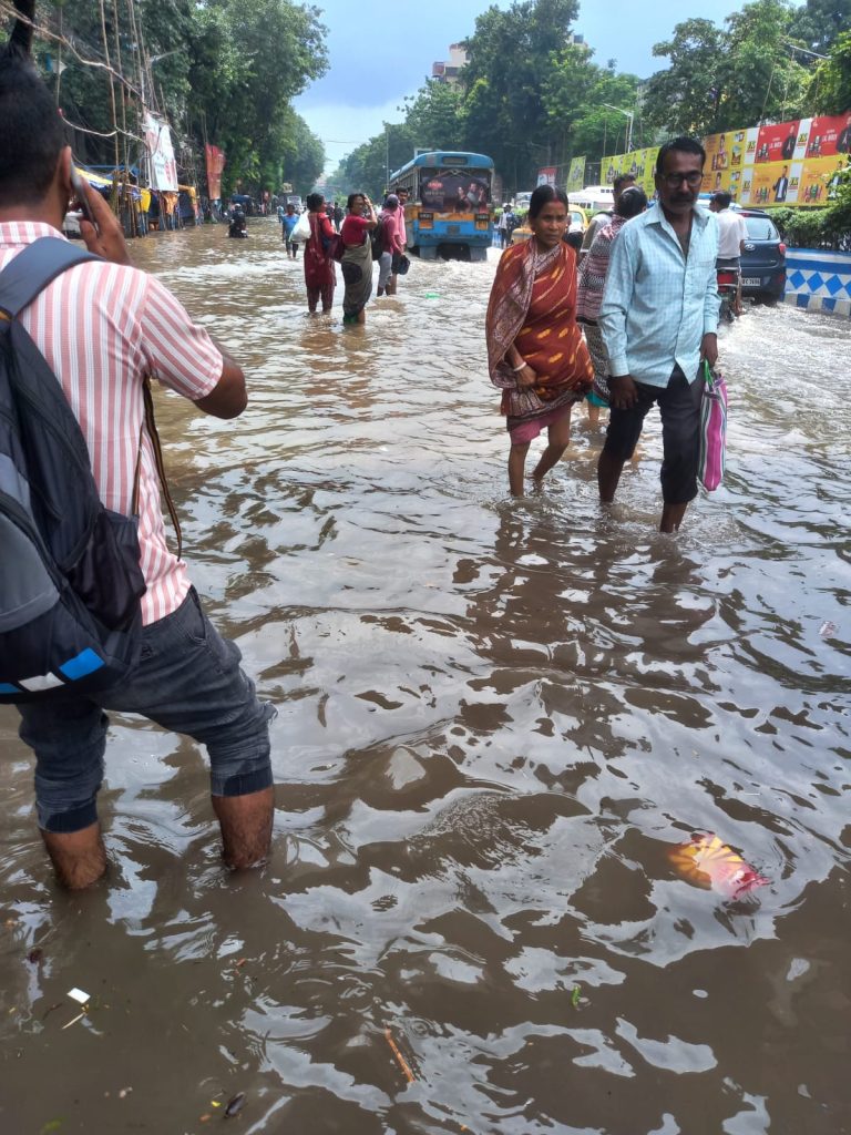 वितेको रातभरि परेको पानीले कोलकाता महानगरको दुर्गति बनाएको छ। यस्तै अवस्थामा पनि मानिसहरू आ-आफ्नो कामतिर लागिरहेका छन् भने गाडीहरू पनि चलिरहेको छ।