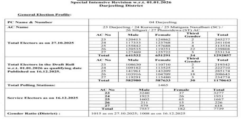 दार्जीलिङ, 18 दिसम्बर (निसं): एसआईआर प्रक्रियाअनुसार, दार्जीलिङ पहाड़ी क्षेत्रका 3 वटा महकुमाबाट मात्रै 61 हजार 660 जना मतदाताको नाम काटियो। समग्रमा दार्जीलिङ जिल्लाका 5 वटा विधानसभा क्षेत्र अनि कालेबुङ जिल्लाबाट 1 लाख 39 हजार 545 जना मतदाताको नाम काटिएको चुनाउ आयोगद्वारा जारी गरिएको ड्राफ्टबाट स्पष्ट भएको छ। 16 दिसम्बरको दिन चुनाउ आयोगद्वारा जारी गरिएको ड्राफ्टमा बताइएअनुसार, 27 अक्टोबर 2025-सम्म दार्जीलिङ जिल्लामा मोठ मतदाता संख्या 12 लाख 92 हजार 857 जना थियो भने तीमध्ये 1 लाख 22 हजार 214 जना मतदाताको नाम मतदाता सूचीबाट काटिएको छ। यसरी नै कालेबुङ जिल्लामा त्यस समय मोठ 2 लाख 20 हजार 862 जना मतदाता थिए भने एसआईआर प्रक्रियाअनुसार, 17 हजार 331 जना मतदाताको नाम काटिएको स्पष्ट भएको छ।